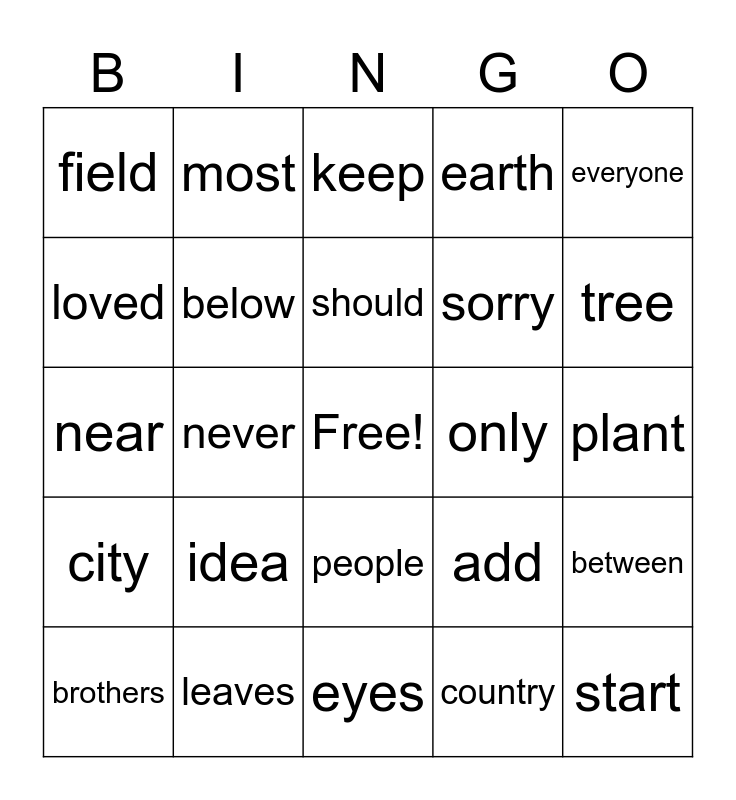 This bingo card has a free space and 24 words: idea, leaves, should, brothers, everyone, field, loved, most, only, people, sorry, near, add, between, below, country, plant, keep, tree, never, start, city, earth and eyes.