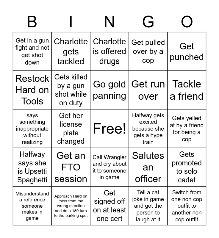This bingo card has a free space and 38 words: Turtles a cop car, Does Legion Square patrol, Gets yelled at by high command, Gets killed by a gun shot while on duty, Gets promoted to solo cadet, Get an FTO session, Go gold panning, Eat at roosters rest, Get punched, Get run over, Get her license plate changed, Get pulled over by a cop, Switch from one non cop outfit to another non cop outfit, Gets yelled at by a friend for being a cop, Restock Hard on Tools, Halfway says she is Upsetti Spaghetti, Meatball makes an appearance on screen, Charlotte is offered drugs, Get in her car and drive somewhere without looking at gps and not get lost, Halfway gets excited because she gets a hype train, Get in a gun fight and not get shot down, Approach Hard on tools from the wrong direction and do a 180 turn to the parking spot, Tackle a friend, Misunderstand a reference someone makes in game, Call out a 10 code that another officer does not understand, Get signed off on at least one cert, Have a business meeting, Talk to an npc, Pull over another cop for breaking the law, Ask Peach “What do you mean”, Call preacher, Call Wrangler and cry about it to someone in game, Tell a cat joke in game and get the person to laugh at it, Charlotte gets tackled, says "FER WHAT", Salutes an officer, says something inappropriate without realizing and Does the superhero pose.