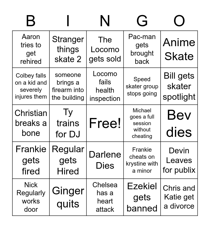 This bingo card has a free space and 24 words: Regular gets Hired, Ginger quits, Locomo fails health inspection, Nick Regularly works door, Anime Skate, Aaron tries to get rehired, Colbey falls on a kid and severely injures them, Stranger things skate 2, Michael goes a full session without cheating, Darlene Dies, Speed skater group stops going, Christian breaks a bone, Frankie cheats on krystine with a minor, Devin Leaves for publix, someone brings a firearm into the building, Ezekiel gets banned, Bev dies, The Locomo gets sold, Bill gets skater spotlight, Ty trains for DJ, Chris and Katie get a divorce, Frankie gets fired, Pac-man gets brought back and Chelsea has a heart attack.