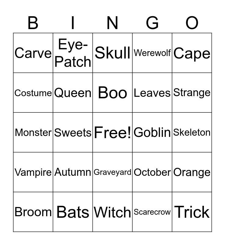 This bingo card has a free space and 24 words: Autumn, Bats, Boo, Broom, Cape, Carve, Costume, Eye-Patch, Goblin, Graveyard, Leaves, Monster, October, Orange, Queen, Scarecrow, Skeleton, Skull, Strange, Sweets, Trick, Vampire, Werewolf and Witch.