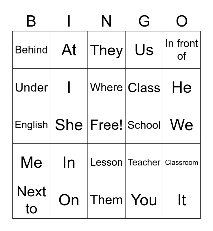 This bingo card has a free space and 24 words: In, On, Where, Next to, In front of, Behind, Under, At, School, Lesson, Class, English, Teacher, Classroom, I, You, We, They, He, She, It, Me, Us and Them.