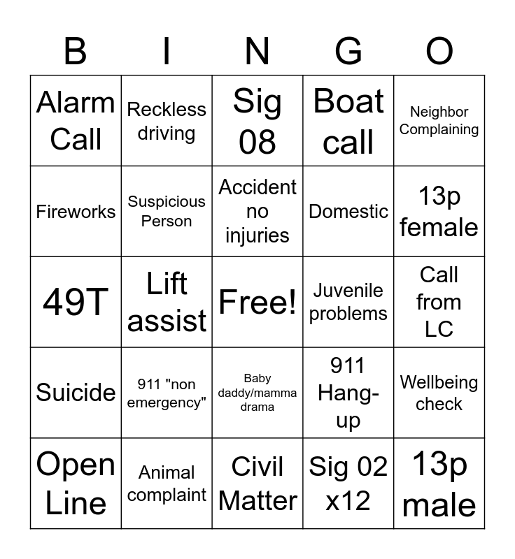 This bingo card has a free space and 24 words: 911 "non emergency", Animal complaint, Accident no injuries, Open Line, Neighbor Complaining, Alarm Call, Fireworks, Reckless driving, Juvenile problems, Baby daddy/mamma drama, Domestic, 49T, 911 Hang-up, Wellbeing check, Suspicious Person, Sig 02 x12, Call from LC, Sig 08, 13p female, Lift assist, 13p male, Suicide, Boat call and Civil Matter.