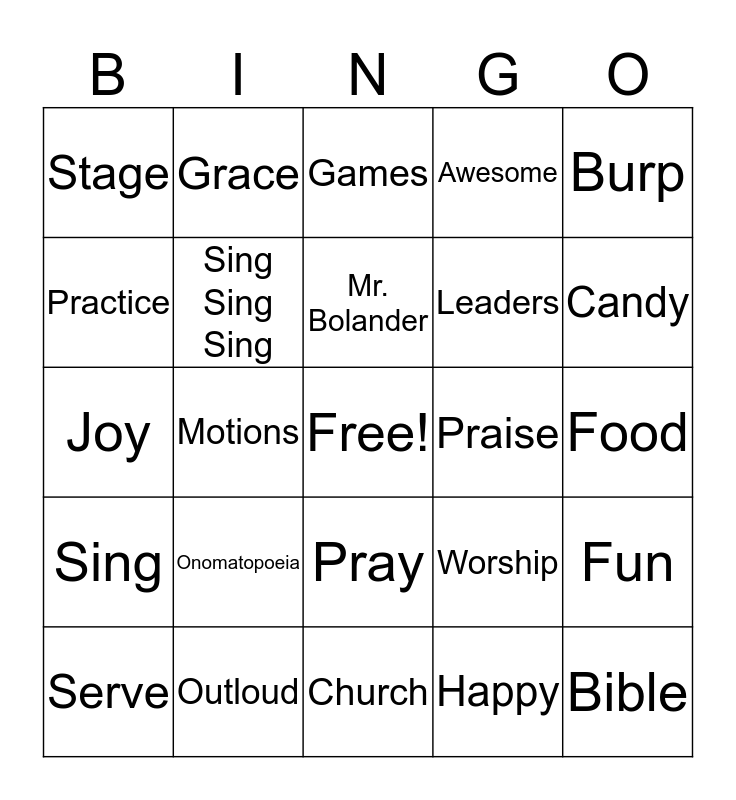 This bingo card has a free space and 36 words: Team, Faith, When I Obey, Sing Sing Sing, Worship, Sing, Mr. Bolander, Boom Chaka-Laka, Burp, Friends, Motions, Awesome, God, Praise, Candy, Stage, Shine, Onomatopoeia, Bible, Games, Food, Fun, Outloud, Serve, Church, Grace, Joy, Praise Party, Leaders, Practice, Jesus, Excitement, Happy, Pray, Dance and Jump.