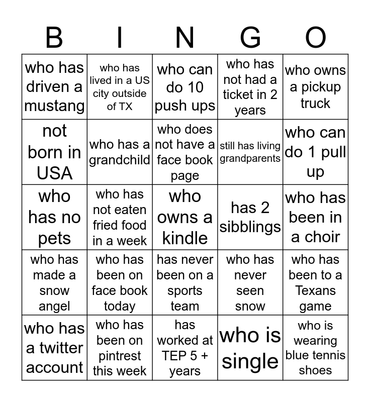 This bingo card has a free space and 24 words: who has been on face book today, who has been on pintrest this week, who does not have a face book page, who has a twitter account, who owns a pickup truck, who has driven a mustang, not born in USA, who has lived in a US city outside of TX, has 2 sibblings, has never been on a sports team, still has living grandparents, who has no pets, who has never seen snow, who has been to a Texans game, who has a grandchild, who is single, who has been in a choir, who can do 10 push ups, who can do 1 pull up, who has not eaten fried food in a week, who is wearing blue tennis shoes, who has made a snow angel, who has not had a ticket in 2 years and has worked at TEP 5 + years.