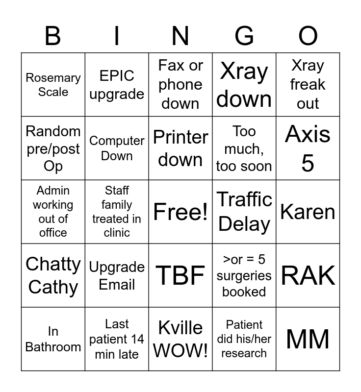 This bingo card has a free space and 24 words: Upgrade Email, Last patient 14 min late, Printer down, In Bathroom, Xray freak out, Rosemary Scale, Random pre/post Op, EPIC upgrade, Traffic Delay, TBF, Too much, too soon, Admin working out of office, >or = 5 surgeries booked, RAK, Computer Down, Patient did his/her research, Karen, Fax or phone down, Axis 5, Staff family treated in clinic, MM, Chatty Cathy, Xray down and Kville WOW!.