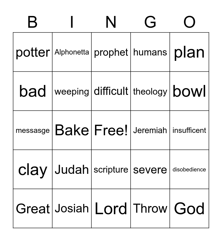 This bingo card has a free space and 29 words: Great, British, Bake, Off, potter, prophet, weeping, Judah, Jeremiah, Josiah, insufficent, God, Lord, Throw, bowl, perfect, scripture, clay, plan, messasge, severe, love, theology, bad, humans, Alphonetta, disobedience, difficult and scripture.