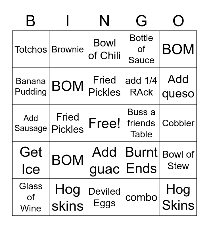 This bingo card has a free space and 24 words: BOM, Hog skins, Fried Pickles, Glass of Wine, BOM, Totchos, Banana Pudding, Brownie, Buss a friends Table, Add guac, add 1/4 RAck, Add Sausage, Burnt Ends, Bowl of Stew, BOM, combo, Cobbler, Bowl of Chili, Add queso, Fried Pickles, Hog Skins, Get Ice, Bottle of Sauce and Deviled Eggs.