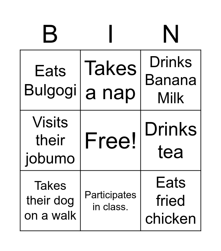 This bingo card has a free space and 8 words: Drinks tea, Drinks Banana Milk, Takes a nap, Takes their dog on a walk, Eats Bulgogi, Eats fried chicken, Visits their jobumo and Participates in class..