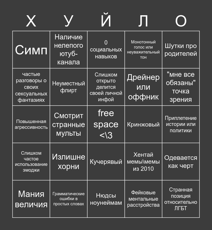 This bingo card has a free space and 24 words: Излишне хорни, Грамматические ошибки в простых словах, Слишком открыто делится своей личной инфой, Мания величия, Шутки про родителей, Симп, частые разговоры о своих сексуальных фантазиях, Наличие нелепого ютуб-канала, Кринжовый, Кучерявый, Дрейнер или оффник, Повышенная агрессивность, Хентай мемы\мемы из 2010, Одевается как черт, Неуместный флирт, Фейковые ментальные расстройства, Приплетение истории или политики, 0 социальных навыков, "мне все обязаны" точка зрения, Смотрит странные мульты, Странная позиция относительно ЛГБТ, Слишком частое использование эмоджи, Монотонный голос или неуважительный тон and Нюдсы ноунеймам.