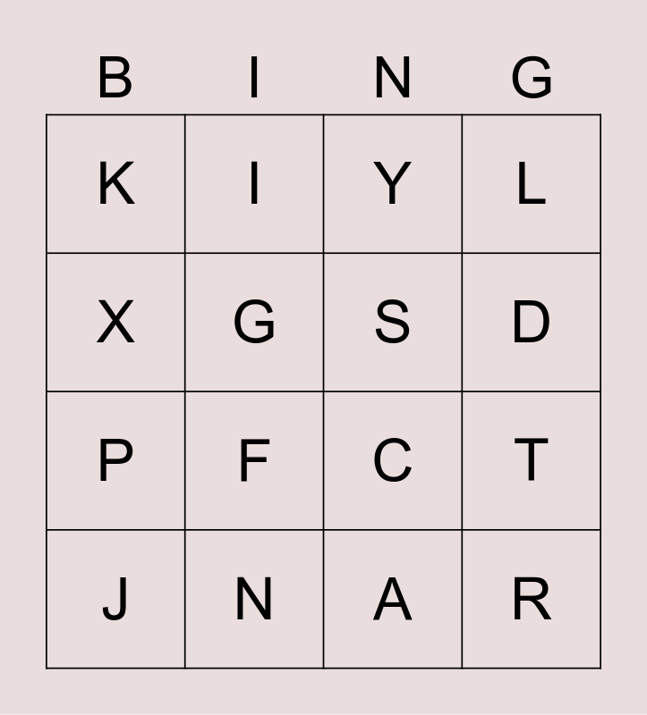 This bingo card has 16 words: N, T, Y, K, P, I, C, A, X, G, J, L, F, D, S and R.