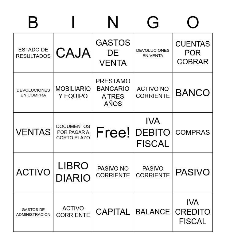 This bingo card has a free space and 25 words: ACTIVO, ACTIVO CORRIENTE, CAPITAL, BALANCE, CUENTAS POR COBRAR, ESTADO DE RESULTADOS, CAJA, GASTOS DE VENTA, IVA DEBITO FISCAL, PASIVO, DEVOLUCIONES EN COMPRA, MOBILIARIO Y EQUIPO, CUENTAS POR PAGAR, PASIVO CORRIENTE, BANCO, GASTOS DE ADMINISTRACION, DOCUMENTOS POR PAGAR A CORTO PLAZO, PRESTAMO BANCARIO A TRES AÑOS, ACTIVO NO CORRIENTE, COMPRAS, VENTAS, LIBRO DIARIO, PASIVO NO CORRIENTE, DEVOLUCIONES EN VENTA and IVA CREDITO FISCAL.