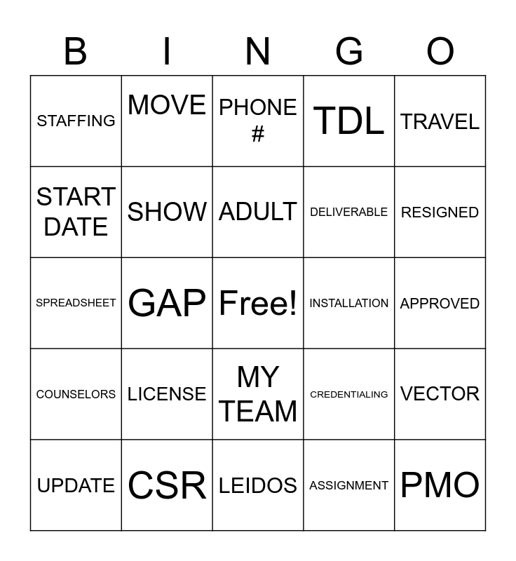 This bingo card has a free space and 54 words: MFLC, COUNSELORS, FILTER, CHAT, MY TEAM, TEAM LEAD, TDL, END DATE, START DATE, NOTE, STAFFING, BOSS, CSR, UPDATE, OSD, LEIDOS, PMO, DELIVERABLE, NEW ACTION, APPROVED, CREDENTIALING, UNICODE, INSTALLATION, TRAVEL, CHECK, MOVE, ERP, SECURITY, RECRUITING, ASSIGNMENT, ASSIGNMENT READY, ARCHIVED, SUBK, BOG, PHONE #, EMAIL, SPREADSHEET, VECTOR, DATA, SHOW, HIDE, COPY, QUALITY, OPERATIONS, LICENSE, STATE, CHILD, PASTE, ADULT, GAP, RESIGNED, CHANGE, DUPLICATE and TOOL.