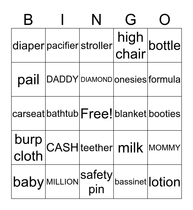 This bingo card has a free space and 24 words: CASH, MILLION, DIAMOND, baby, bottle, diaper, pail, pacifier, blanket, teether, onesies, carseat, milk, MOMMY, DADDY, bassinet, booties, stroller, formula, bathtub, lotion, burp cloth, high chair and safety pin.