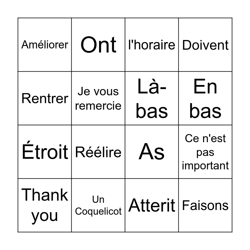This bingo card has 16 words: Un Coquelicot, Ce n'est pas important, l'horaire, Améliorer, Étroit, Ont, As, Atterit, Rentrer, Je vous remercie, Thank you, Doivent, Réélire, En bas, Là-bas and Faisons.