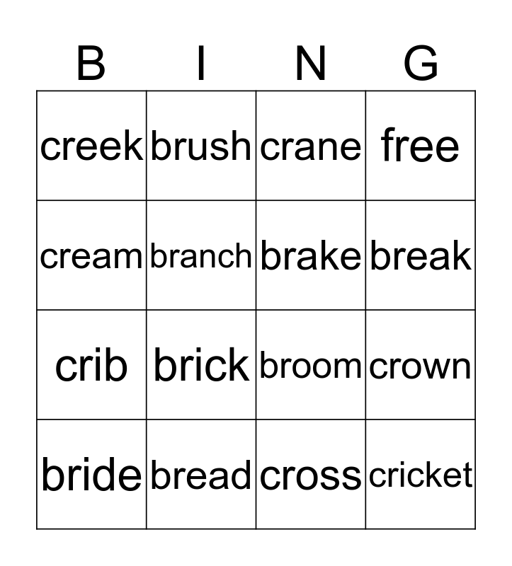 This bingo card has a free space and 19 words: cricket, crab, crane, cry, crown, cream, cross, creek, brush, crib, brick, branch, brake, bread, bride, free, free, break and bridge.