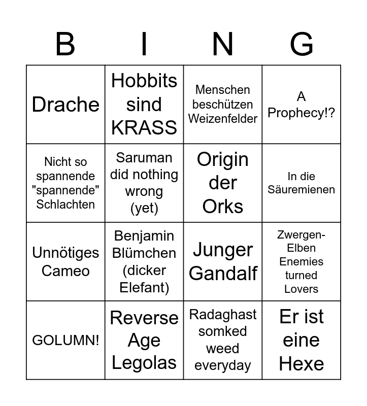 This bingo card has 16 words: Reverse Age Legolas, Zwergen-Elben Enemies turned Lovers, Menschen beschützen Weizenfelder, Drache, Unnötiges Cameo, Hobbits sind KRASS, Junger Gandalf, Radaghast somked weed everyday, Nicht so spannende "spannende" Schlachten, Saruman did nothing wrong (yet), GOLUMN!, A Prophecy!?, Benjamin Blümchen (dicker Elefant), In die Säuremienen, Origin der Orks and Er ist eine Hexe.