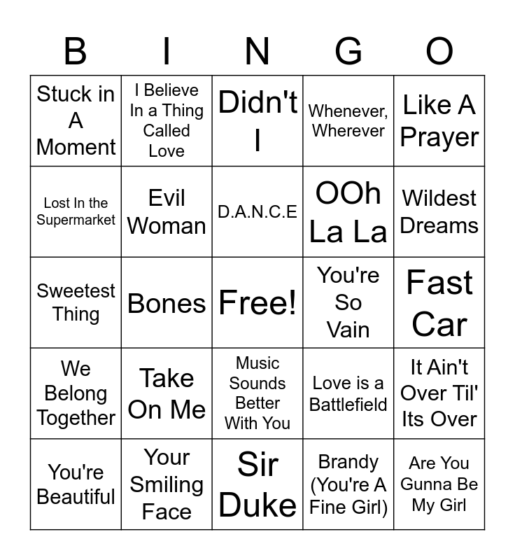 This bingo card has a free space and 76 words: Reelin' In The Years, So Hot you're Hurting my Feelings, Didn't I, Every Time You Go Away, She Drives Me Crazy, You've Got The Love, Move On Up, Send Me On My Way, All Night Long, You Get What You Give, You Can Call Me Al, Love will tear us apart, D.A.N.C.E, Lost In the Supermarket, One Toke Over The Line, Bones, Everybody Wants to Rule the World, Are You Gunna Be My Girl, That Don't Impress Me Much, Like A Prayer, I'm Gonna Be (5000 Miles), Sweetest Thing, Evil Woman, I Believe In a Thing Called Love, Whenever, Wherever, Time After Time, Islands In The Stream, Can't Stop, Sweet City Woman, Karma Chameleon, Lovely Day, Are You Ready For Love?, This Will Be (An Everlasting Love), Love is a Battlefield, Wildest Dreams, OOh La La, I'm On Fire, When We Were On Fire, Fast Car, Brandy (You're A Fine Girl), Beast of Burden, Fire, Get Ur Freak On, December 1963 (Oh! What a Night), Ain't Nobody, Harmonium, You're Beautiful, Stuck in A Moment, White Flag, Wannabe, Freedom, Music Sounds Better With You, Get Down On It, California Soul, I'll Take You There, Hold On, I'm Comin', Son Of A Preacher Man, Baby I Need Your Loving, Be Young, Be Foolish, Be Happy, She's A Bad Mama Jama, Take On Me, Dancing In the Dark, The Boys Of Summer, Never Gonna Give You Up, I Go Blind, Love Is Like Oxygen, You're So Vain, Brown Eyed Girl, White Room, Good Times, It Ain't Over Til' Its Over, We Belong Together, Your Smiling Face, Modern Love, Sir Duke and Right Down The Line.