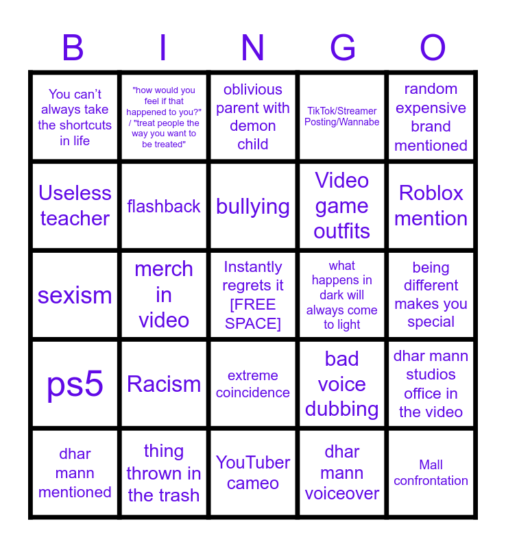 This bingo card has a free space and 32 words: dhar mann voiceover, "you see" / "so you see", merch in video, time skip, ps5, flashback, random expensive brand mentioned, dhar mann studios office in the video, "how would you feel if that happened to you?" / "treat people the way you want to be treated", parking lot confrontation, bullying, oblivious parent with demon child, kids with ipad, cartoon supervillain, what happens in dark will always come to light, continuity error, dhar mann mentioned, sexism, extreme coincidence, Racism, bad voice dubbing, poor shaming/money obsession, being different makes you special, thing thrown in the trash, Mall confrontation, TikTok/Streamer Posting/Wannabe, Video game outfits, Useless teacher, You can’t always take the shortcuts in life, YouTuber cameo, "you know, my ___ used to say" and Roblox mention.