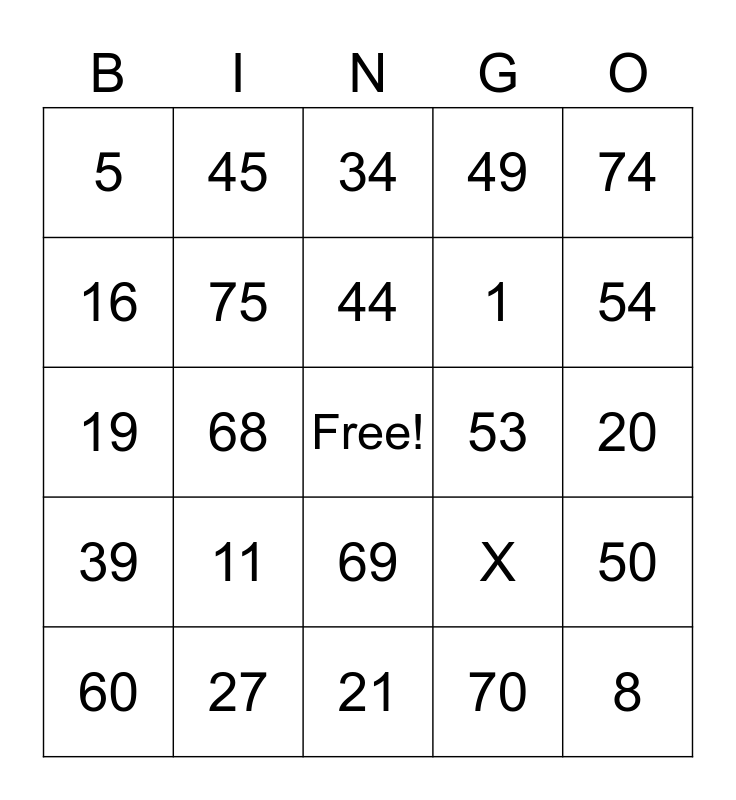 This bingo card has a free space and 25 words: 11, 21, 44, 60, 74, 5, 16, 45, 53, 69, 1, 19, X, 50, 75, 9, 20, 34, 54, 68, 8, 27, 39, 49 and 70.