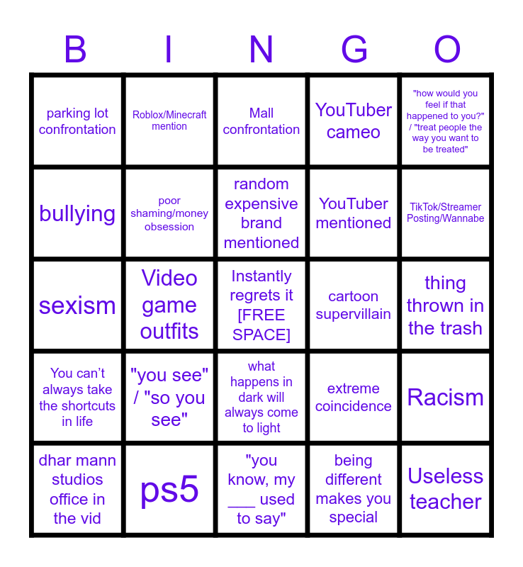 This bingo card has a free space and 24 words: "you see" / "so you see", ps5, random expensive brand mentioned, dhar mann studios office in the vid, "how would you feel if that happened to you?" / "treat people the way you want to be treated", parking lot confrontation, bullying, Roblox/Minecraft mention, cartoon supervillain, what happens in dark will always come to light, YouTuber mentioned, sexism, extreme coincidence, Racism, poor shaming/money obsession, being different makes you special, thing thrown in the trash, Mall confrontation, TikTok/Streamer Posting/Wannabe, Video game outfits, Useless teacher, You can’t always take the shortcuts in life, YouTuber cameo and "you know, my ___ used to say".