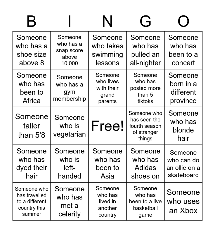 This bingo card has a free space and 24 words: Someone who has travelled to a different country this summer, Someone who is left-handed, Someone who lives with their grand parents, Someone who has been to a live basketball game, Someone who has been to a concert, Someone who has a shoe size above 8, Someone who has a snap score above 10,000, Someone who takes swimming lessons, Someone who has seen the fourth season of stranger things, Someone who has blonde hair, Someone taller than 5'8, Someone who has a gym membership, Someone who has Adidas shoes on, Someone who can do an ollie on a skateboard, Someone who has been to Africa, Someone who has met a celerity, Someone who has lived in another country, Someone who has pulled an all-nighter, Someone born in a different province, Someone who has dyed their hair, Someone who is vegetarian, Someone who has been to Asia, Someone who has posted more than 5 tiktoks and Someone who uses an Xbox.