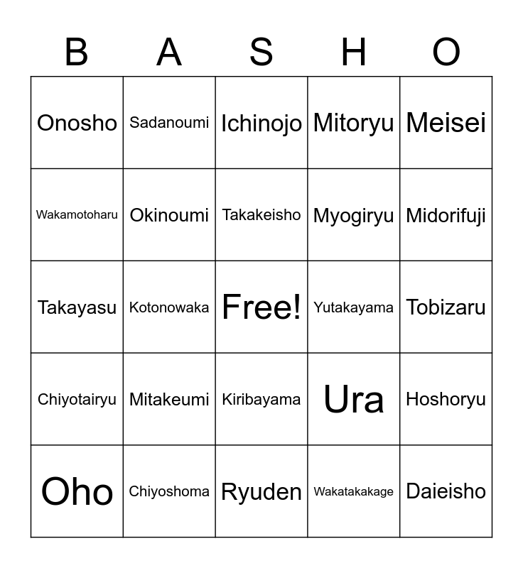 This bingo card has a free space and 42 words: Terunofuji, Takakeisho, Shodai, Mitakeumi, Wakatakakage, Hoshoryu, Daieisho, Abi, Ichinojo, Kiribayama, Tobizaru, Midorifuji, Kotonowaka, Meisei, Tamawashi, Ura, Nishikigi, Takayasu, Takarafuji, Sadanoumi, Wakamotoharu, Endo, Aoiyama, Onosho, Tochinoshin, Hokutofuji, Myogiryu, Kotoeko, Nishikifuji, Takanosho, Kotoshoho, Chiyotairyu, Okinoumi, Ryuden, Ichiyamamoto, Oho, Chiyoshoma, Yutakayama, Terutsuyoshi, Tsurugisho, Mitoryu and Hiradoumi.