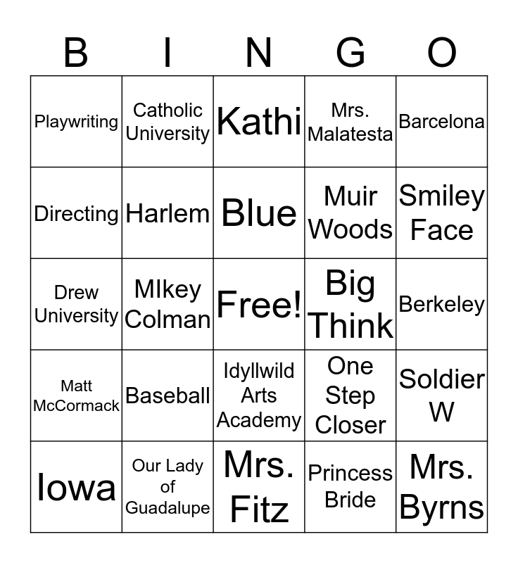 This bingo card has a free space and 24 words: Baseball, Our Lady of Guadalupe, Blue, Iowa, Barcelona, Playwriting, Directing, Catholic University, Big Think, Idyllwild Arts Academy, Muir Woods, Drew University, One Step Closer, Soldier W, Harlem, Princess Bride, Berkeley, Kathi, Smiley Face, MIkey Colman, Mrs. Byrns, Matt McCormack, Mrs. Malatesta and Mrs. Fitz.