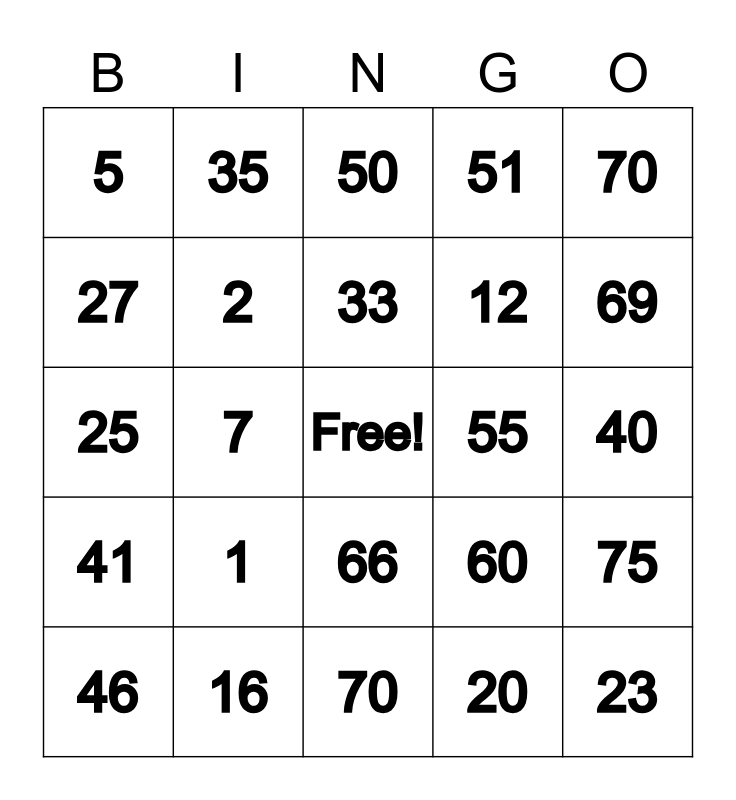 This bingo card has a free space and 24 words: 1, 16, 33, 46, 70, 5, 27, 35, 55, 66, 12, 25, 60, 75, 2, 20, 40, 50, 69, 7, 23, 41, 51 and 70.