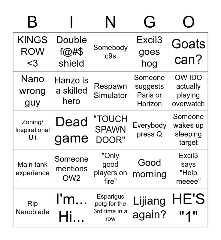 This bingo card has 25 words: Someone mentions OW2, Esparigus potg for the 3rd time in a row, Respawn Simulator, Rip Nanoblade, Goats can?, KINGS ROW <3, Nano wrong guy, Double f@#$ shield, Everybody press Q, "Only good players on fire", Someone suggests Paris or Horizon, Zoning/ Inspirational Ult, Good morning, Excil3 says "Help meeee", Hanzo is a skilled hero, HE'S "1", Someone wakes up sleeping target, Somebody c9s, OW IDO actually playing overwatch, Dead game, "TOUCH SPAWN DOOR", I'm... Hi..., Main tank experience, Excil3 goes hog and Lijiang again?.