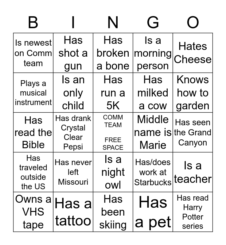 This bingo card has a free space and 24 words: Has never left Missouri, Has a tattoo, Has run a 5K, Owns a VHS tape, Hates Cheese, Is newest on Comm team, Plays a musical instrument, Has shot a gun, Middle name is Marie, Is a night owl, Has milked a cow, Has read the Bible, Has/does work at Starbucks, Is a teacher, Is an only child, Has a pet, Has seen the Grand Canyon, Has broken a bone, Knows how to garden, Has drank Crystal Clear Pepsi, Has read Harry Potter series, Has traveled outside the US, Is a morning person and Has been skiing.