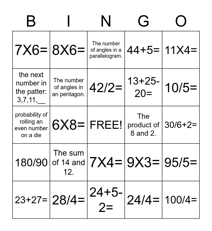 This bingo card has a free space and 24 words: The sum of 14 and 12., 28/4=, 42/2=, 23+27=, 11X4=, 7X6=, the next number in the patter: 3,7,11,__, 8X6=, The product of 8 and 2., 7X4=, 13+25-20=, probability of rolling an even number on a die, 9X3=, 95/5=, The number of angles in an pentagon., 24/4=, 30/6+2=, The number of angles in a parallelogram., 10/5=, 6X8=, 100/4=, 180/90, 44+5= and 24+5-2=.