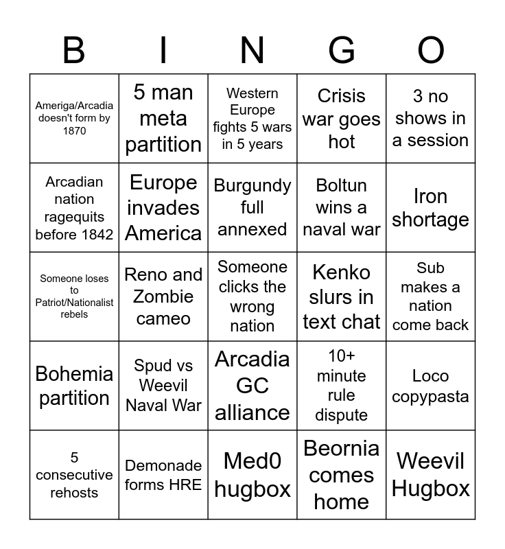 This bingo card has a free space and 24 words: Spud vs Weevil Naval War, Demonade forms HRE, Burgundy full annexed, 5 consecutive rehosts, 3 no shows in a session, Ameriga/Arcadia doesn't form by 1870, Arcadian nation ragequits before 1842, 5 man meta partition, Kenko slurs in text chat, Arcadia GC alliance, Boltun wins a naval war, Someone loses to Patriot/Nationalist rebels, 10+ minute rule dispute, Loco copypasta, Europe invades America, Beornia comes home, Sub makes a nation come back, Western Europe fights 5 wars in 5 years, Iron shortage, Reno and Zombie cameo, Weevil Hugbox, Bohemia partition, Crisis war goes hot and Med0 hugbox.