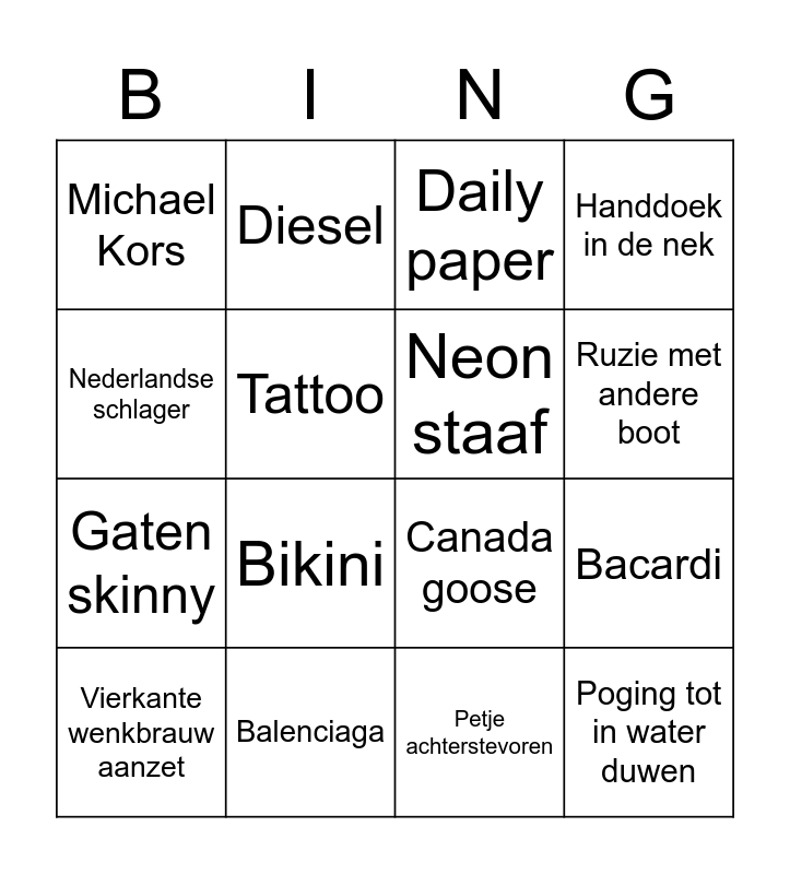 This bingo card has 16 words: Balenciaga, Bacardi, Daily paper, Michael Kors, Gaten skinny, Diesel, Canada goose, Petje achterstevoren, Nederlandse schlager, Tattoo, Vierkante wenkbrauw aanzet, Handdoek in de nek, Bikini, Ruzie met andere boot, Neon staaf and Poging tot in water duwen.