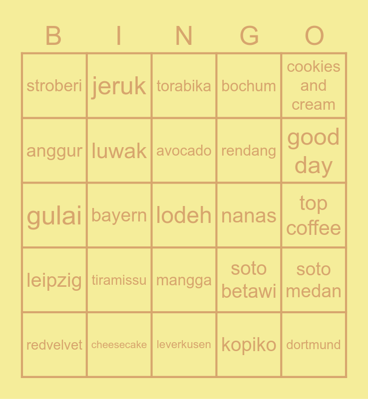 This bingo card has a free space and 24 words: tiramissu, cheesecake, avocado, redvelvet, cookies and cream, stroberi, anggur, jeruk, nanas, mangga, rendang, gulai, soto betawi, soto medan, luwak, kopiko, top coffee, torabika, good day, bayern, dortmund, leipzig, bochum and leverkusen.