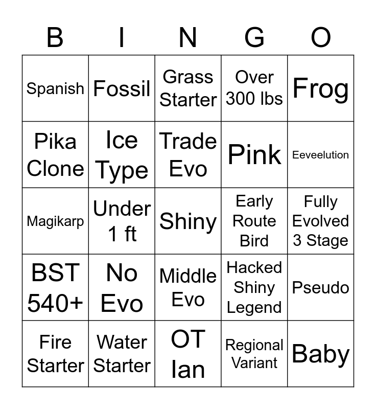 This bingo card has 25 words: No Evo, OT Ian, Trade Evo, Fire Starter, Frog, Spanish, Pika Clone, Fossil, Early Route Bird, Middle Evo, Pink, Magikarp, Hacked Shiny Legend, Pseudo, Ice Type, Baby, Fully Evolved 3 Stage, Grass Starter, Eeveelution, Under 1 ft, Shiny, Water Starter, BST 540+, Over 300 lbs and Regional Variant.