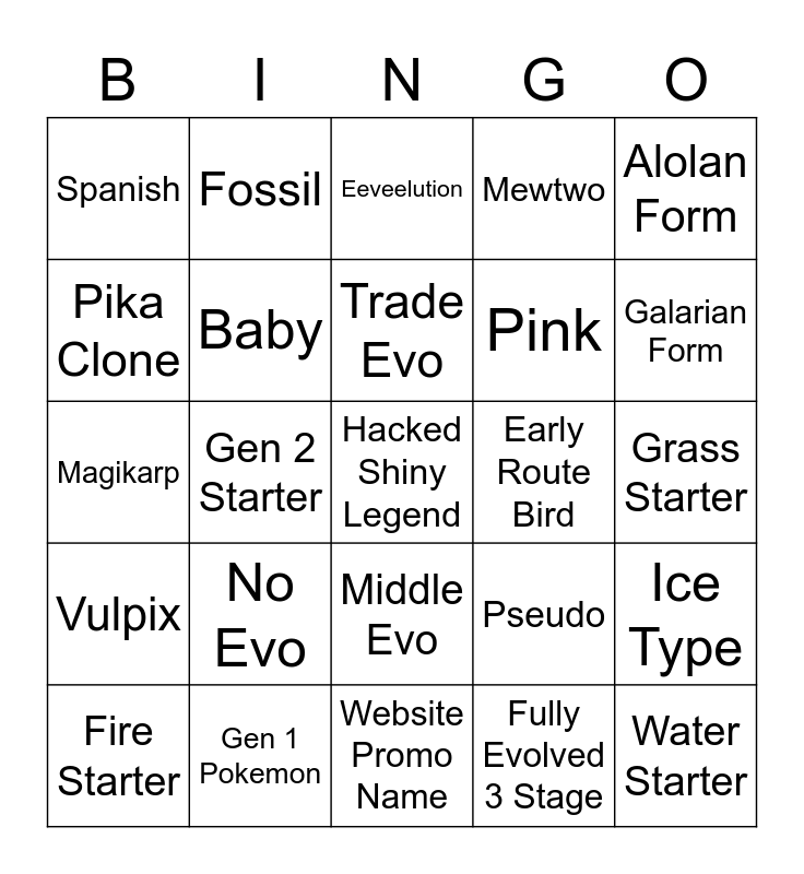 This bingo card has a free space and 24 words: No Evo, Gen 1 Pokemon, Trade Evo, Fire Starter, Alolan Form, Spanish, Pika Clone, Fossil, Early Route Bird, Middle Evo, Pink, Magikarp, Pseudo, Ice Type, Baby, Fully Evolved 3 Stage, Grass Starter, Eeveelution, Galarian Form, Gen 2 Starter, Water Starter, Vulpix, Mewtwo and Website Promo Name.