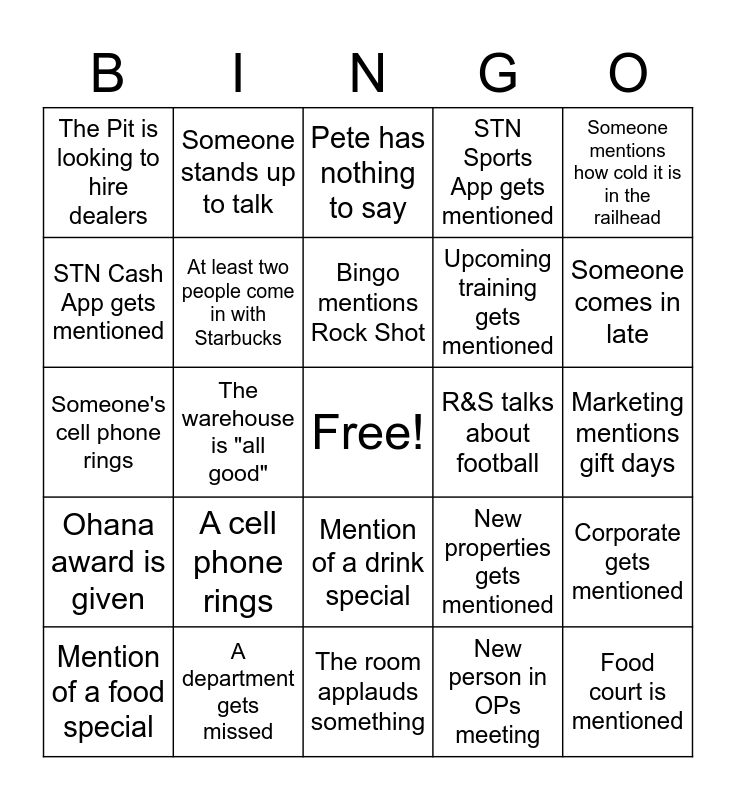 This bingo card has a free space and 24 words: A cell phone rings, A department gets missed, Bingo mentions Rock Shot, Mention of a food special, Someone mentions how cold it is in the railhead, The Pit is looking to hire dealers, STN Cash App gets mentioned, Someone stands up to talk, R&S talks about football, Mention of a drink special, Upcoming training gets mentioned, Someone's cell phone rings, New properties gets mentioned, Corporate gets mentioned, At least two people come in with Starbucks, New person in OPs meeting, Marketing mentions gift days, Pete has nothing to say, Someone comes in late, The warehouse is "all good", Food court is mentioned, Ohana award is given, STN Sports App gets mentioned and The room applauds something.