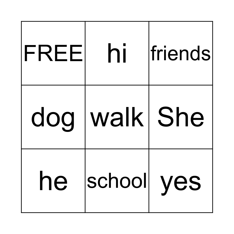 This bingo card has a free space and 8 words: She, friends, hi, he, FREE, yes, dog and school.