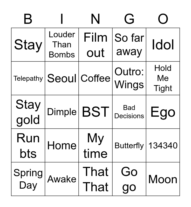 This bingo card has 25 words: Run bts, Awake, BST, Go go, Idol, Stay, Louder Than Bombs, Film out, Bad Decisions, 134340, Telepathy, Seoul, That That, Butterfly, Hold Me Tight, Spring Day, Dimple, Coffee, Outro: Wings, Ego, Stay gold, Home, My time, So far away and Moon.