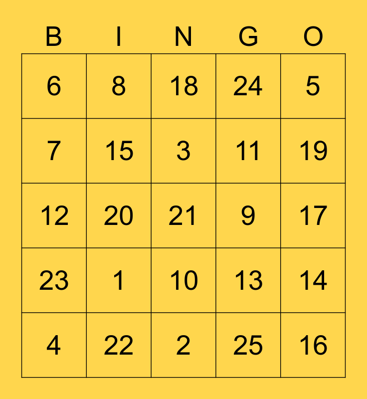 This bingo card has 25 words: 1, 2, 3, 4, 5, 6, 7, 8, 9, 10, 11, 12, 13, 14, 15, 16, 17, 18, 19, 20, 21, 22, 23, 24 and 25.