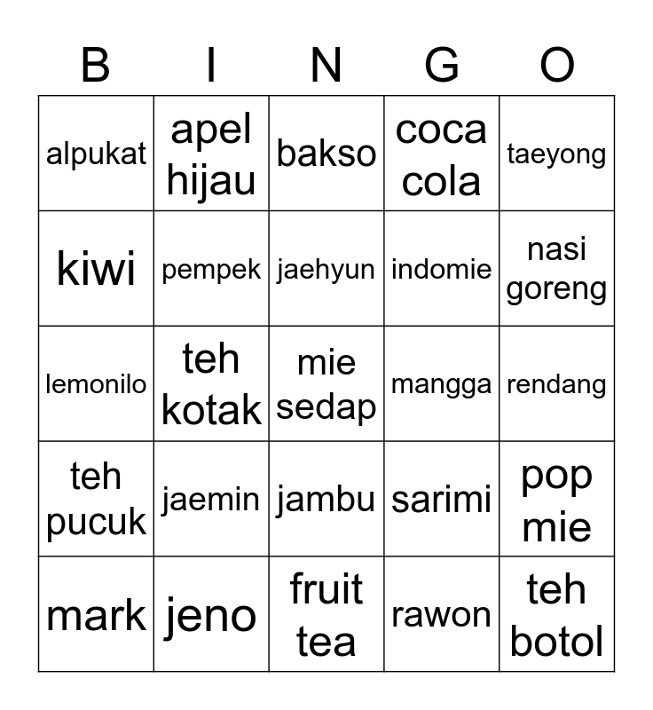 This bingo card has a free space and 24 words: jaemin, jeno, jaehyun, mark, taeyong, alpukat, kiwi, apel hijau, mangga, jambu, indomie, lemonilo, sarimi, pop mie, pempek, rawon, rendang, bakso, nasi goreng, teh kotak, teh botol, teh pucuk, coca cola and fruit tea.