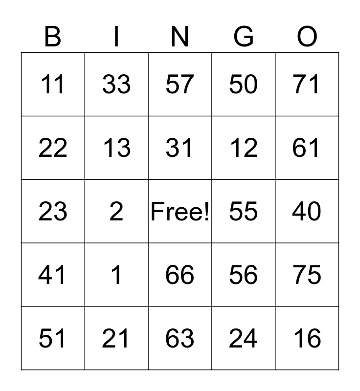This bingo card has a free space and 24 words: 1, 21, 31, 51, 71, 11, 22, 33, 55, 66, 12, 23, 56, 75, 13, 24, 40, 57, 61, 2, 16, 41, 50 and 63.