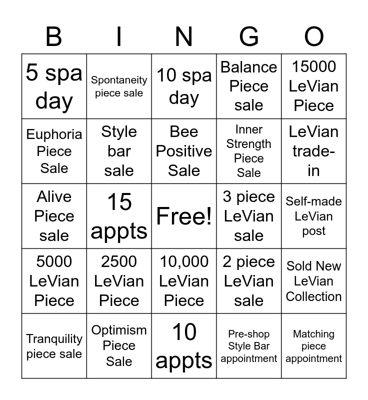 This bingo card has a free space and 31 words: 10 appts, 5 appts, 15 appts, 20 appts, 5 spa day, 10 spa day, Style bar sale, 2 piece LeVian sale, 3 piece LeVian sale, Pre-shop Style Bar appointment, Self-made LeVian post, Matching piece appointment, 5 raffle entries, 10 raffle entries, LeVian trade-in, New LeVian Collector, Sold New LeVian Collection, 2500 LeVian Piece, 5000 LeVian Piece, 10,000 LeVian Piece, 15000 LeVian Piece, 25000 LeVian Piece, Tranquility piece sale, Spontaneity piece sale, Inner Strength Piece Sale, Euphoria Piece Sale, Balance Piece sale, Alive Piece sale, Optimism Piece Sale, Bee Positive Sale and Couture piece sale.
