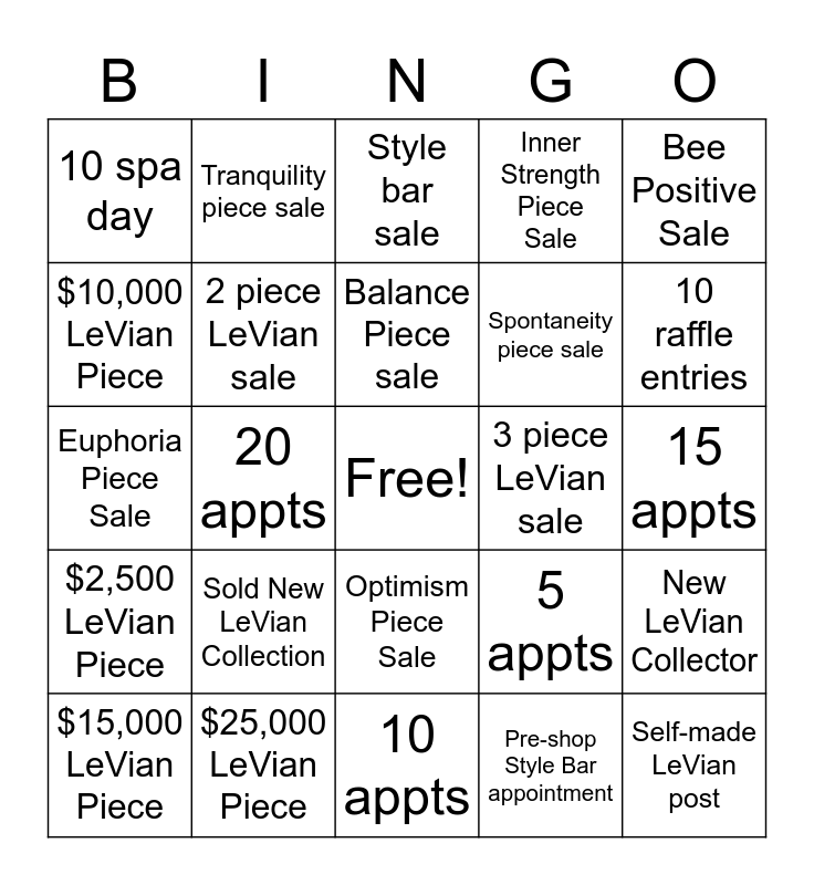 This bingo card has a free space and 31 words: 10 appts, $5,000 LeVian Piece, 20 appts, 5 spa day, 10 spa day, Style bar sale, 2 piece LeVian sale, 5 appts, 3 piece LeVian sale, Pre-shop Style Bar appointment, 15 appts, Self-made LeVian post, Matching piece appointment, 5 raffle entries, 10 raffle entries, LeVian trade in, New LeVian Collector, Sold New LeVian Collection, $2,500 LeVian Piece, Optimism Piece Sale, Bee Positive Sale, Couture piece sale, $15,000 LeVian Piece, Tranquility piece sale, Spontaneity piece sale, $10,000 LeVian Piece, Inner Strength Piece Sale, Euphoria Piece Sale, $25,000 LeVian Piece, Balance Piece sale and Alive Piece sale.