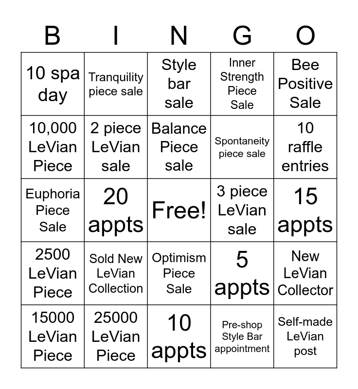 This bingo card has a free space and 31 words: 10 appts, 5000 LeVian Piece, 20 appts, 5 spa day, 10 spa day, Style bar sale, 2 piece LeVian sale, 5 appts, 3 piece LeVian sale, Pre-shop Style Bar appointment, 15 appts, Self-made LeVian post, Matching piece appointment, 5 raffle entries, 10 raffle entries, LeVian trade in, New LeVian Collector, Sold New LeVian Collection, 2500 LeVian Piece, Optimism Piece Sale, Bee Positive Sale, Couture piece sale, 15000 LeVian Piece, Tranquility piece sale, Spontaneity piece sale, 10,000 LeVian Piece, Inner Strength Piece Sale, Euphoria Piece Sale, 25000 LeVian Piece, Balance Piece sale and Alive Piece sale.