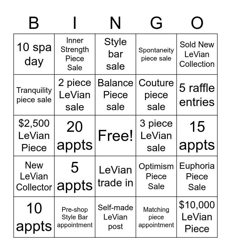 This bingo card has a free space and 29 words: 10 appts, $5,000 LeVian Piece, 20 appts, 5 spa day, 10 spa day, Style bar sale, 2 piece LeVian sale, 5 appts, 3 piece LeVian sale, Pre-shop Style Bar appointment, 15 appts, $10,000 LeVian Piece, Self-made LeVian post, Matching piece appointment, 5 raffle entries, 10 raffle entries, LeVian trade in, New LeVian Collector, Sold New LeVian Collection, $2,500 LeVian Piece, Optimism Piece Sale, Bee Positive Sale, Couture piece sale, Tranquility piece sale, Spontaneity piece sale, Inner Strength Piece Sale, Euphoria Piece Sale, Balance Piece sale and Alive Piece sale.