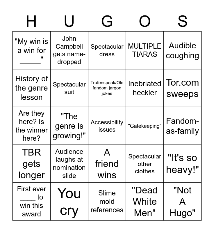 This bingo card has 31 words: Slime mold references, Your favourite wins, "The genre is growing!", Cosplay on stage, "My win is a win for _____", Spectacular dress, Spectacular suit, Spectacular other clothes, "Gatekeeping", "Dead White Men", Fandom-as-family, Accessibility issues, "Not A Hugo", "Unprecedented times", Tor.com sweeps, Accidental profanity from a winner, "It's so heavy!", Audience laughs at nomination slide, TBR gets longer, A friend wins, Audible coughing, Spectacular mask, First ever ____ to win this award, John Campbell gets name-dropped, Inebriated heckler, History of the genre lesson, MULTIPLE TIARAS, Are they here? Is the winner here?, You cry, Trufenspeak/Old fandom jargon jokes and Dramatic Work doesn't send acceptor.