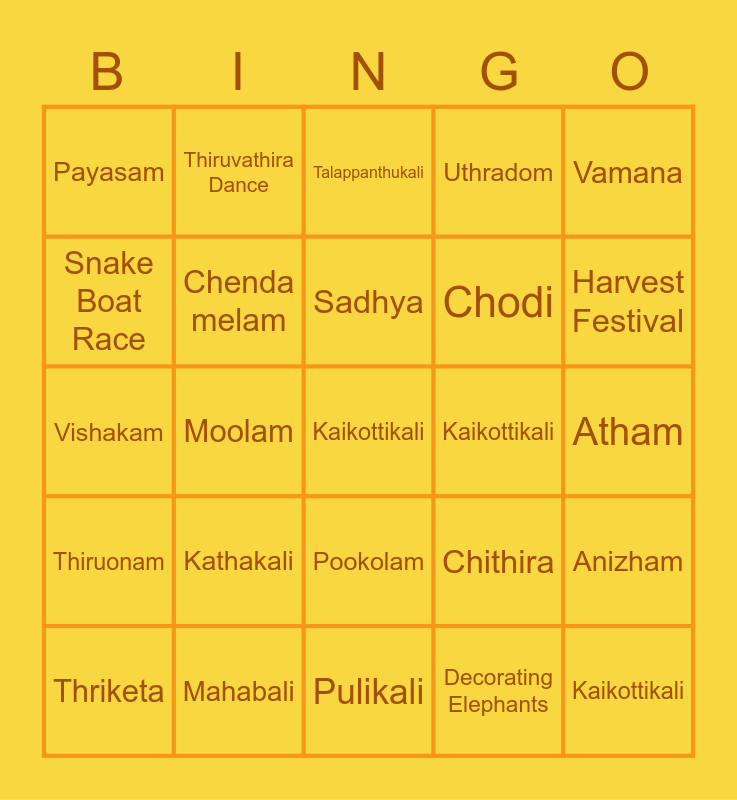 This bingo card has 26 words: Pookolam, Decorating Elephants, Sadhya, Mahabali, Vamana, Payasam, Snake Boat Race, Thiruvathira Dance, Atham, Chithira, Chodi, Vishakam, Anizham, Thriketa, Moolam, Pooradam, Uthradom, Thiruonam, Talappanthukali, Kaikottikali, Harvest Festival, Pulikali, Kaikottikali, Kathakali, Chenda melam and Kaikottikali.