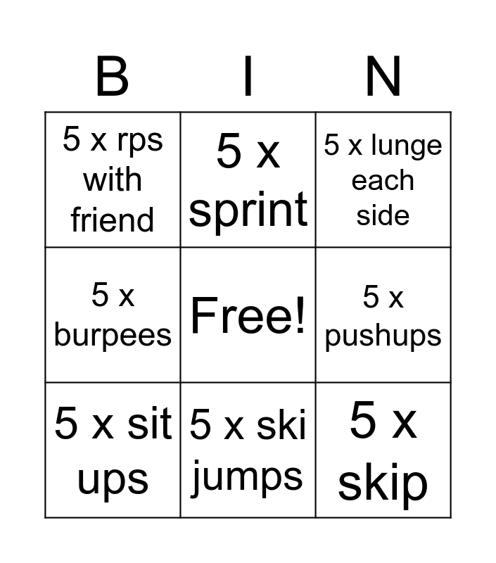 This bingo card has a free space and 8 words: 5 x pushups, 5 x lunge each side, 5 x sprint, 5 x sit ups, 5 x rps with friend, 5 x skip, 5 x burpees and 5 x ski jumps.