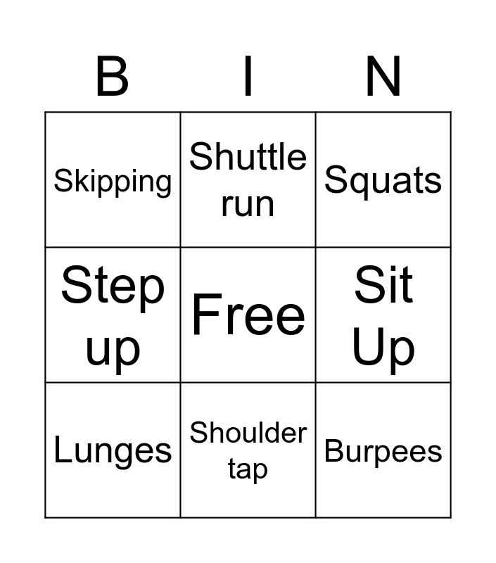 This bingo card has a free space and 8 words: Sit Up, Squats, Shuttle run, Lunges, Skipping, Burpees, Step up and Shoulder tap.